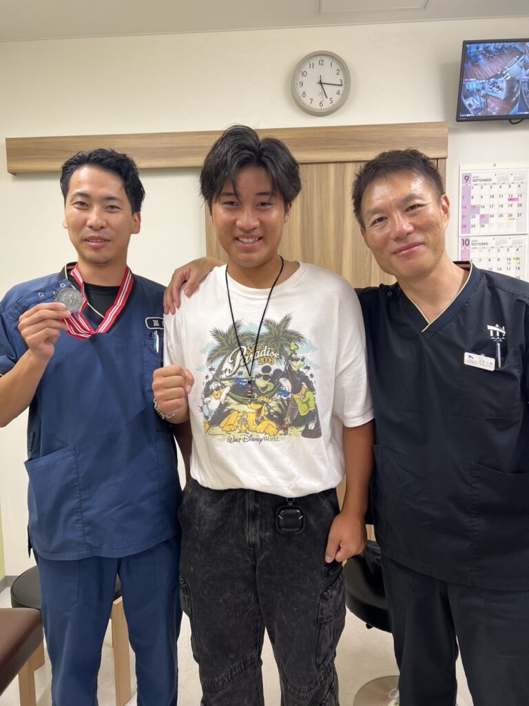 彼は、高校時代に肘のリハビリで、クリニックに通っていました。卒業後は、名古屋の大学に進学し、今回、大学のインカレで準優勝しました!と報告に寄ってくれました。